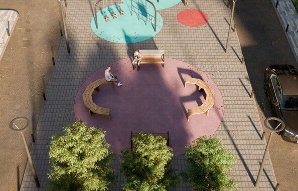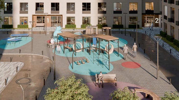 Безопасный и закрытый двор-сад без машин: на территории будут высажены гипоаллергенные цветы и кустарники, высокие деревья, хвойные и яблони. В середине двора - детская площадка,